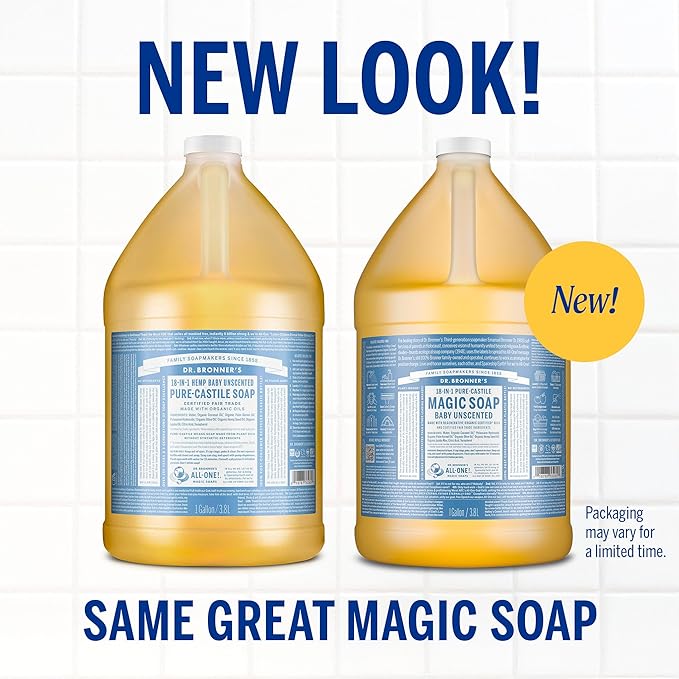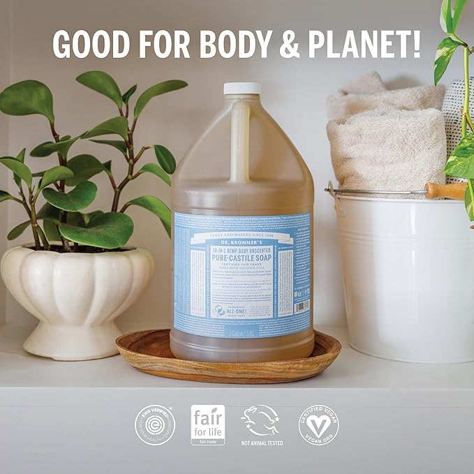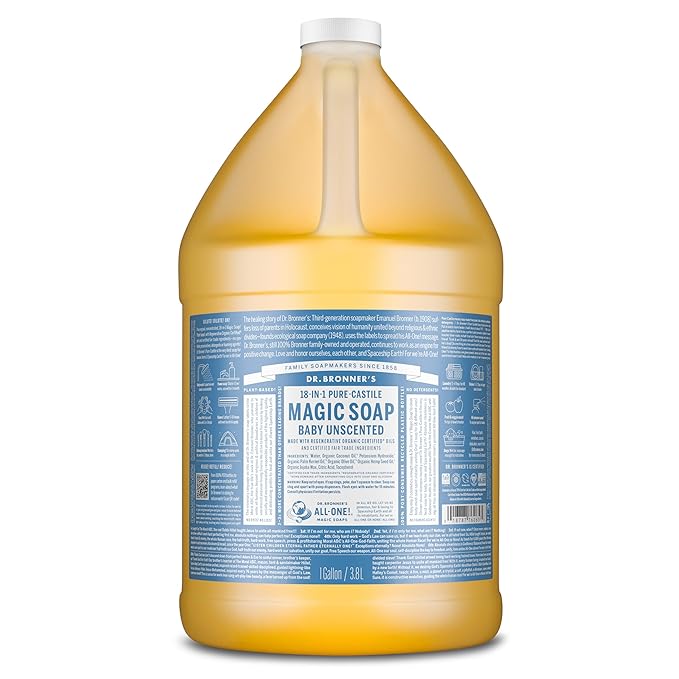 Dr. Bronner's Pure-Castile Magic Soap Liquid (Baby Unscented, 1 Gallon) – Made with Regenerative Organic Certified Oils- For Sensitive Skin, Babies, Face, Hair, Laundry, Dishes, Hand Soap & Body Wash