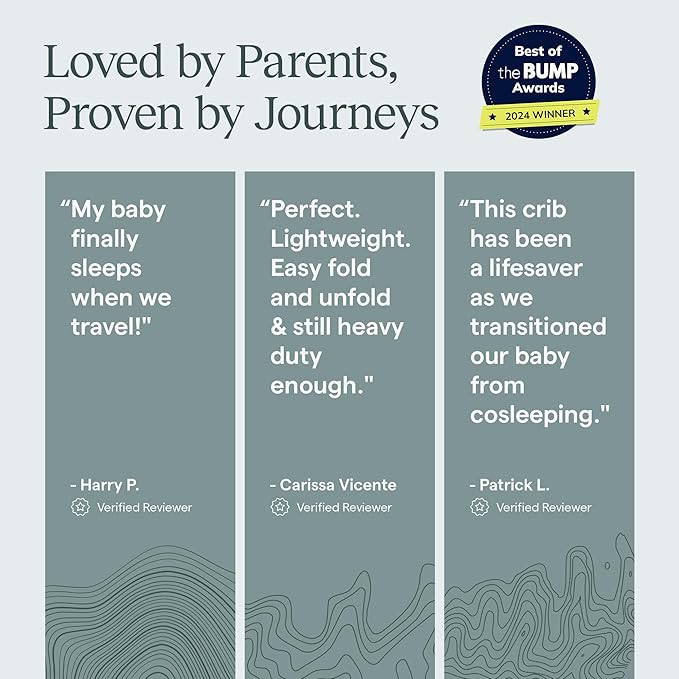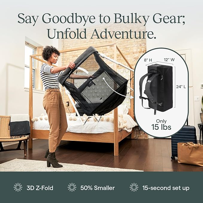- 【WORRY-FREE AIRPORT TRAVEL】3D Z-Fold Technology allows it to fold compact enough to carry through airports, making the Lotus Travel Crib a baby travel essential. The durable yet lightweight design weighs only 15 lbs and can be set up in just 15 seconds! The foldable crib’s ability to be carried as a lightweight backpack allows you to travel hands-free with ease.