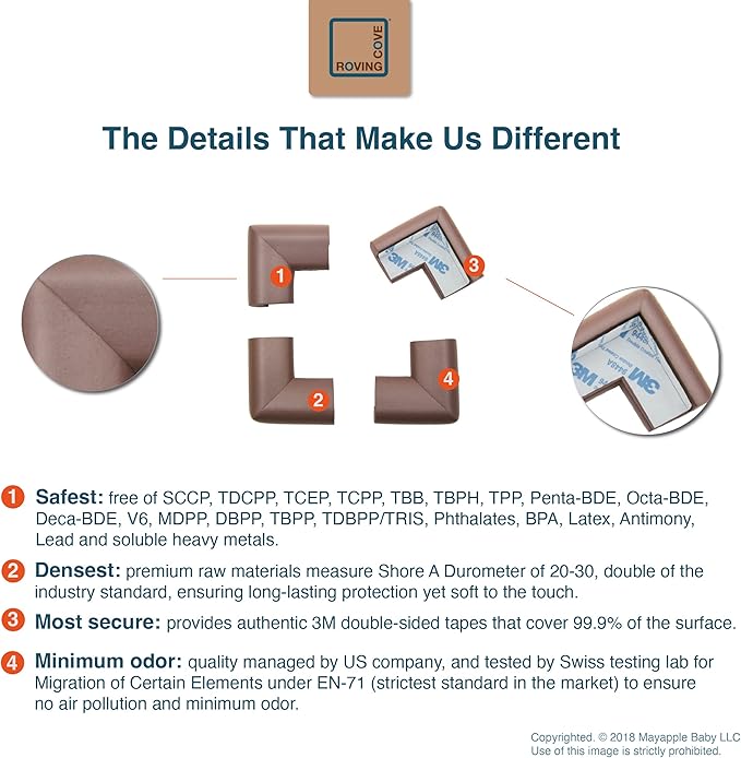 - CLEAN SAFETY: Roving Cove uses safe and pure raw material and was the first brand to make foam safety bumpers without the use of toxic flame-retardant chemicals (SCCPs). Our corner protector contains no BPA, no phthalates, no heavy metals, no latex, no SCCPs. Inherently flame-resistant; passed flammability tests under US regulations.