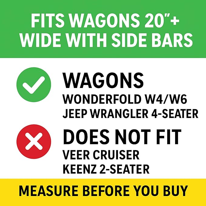 - FITS SELECT 4-SEATER STROLLER WAGONS (20-24” WIDTH REQUIRED) Compatible with WonderFold W4/W6, Jeep Wrangler 4-Seater, and similar wagons with 20-24 inches of interior seat width and horizontal support bars. Not compatible with narrower or unsupported models like Veer Cruiser or Keenz 2-Seaters. Please measure before purchase to ensure safe fit and avoid returns.
