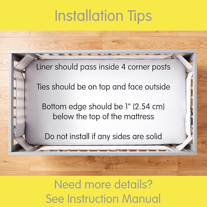 - EASY TO INSTALL: Liner should weave inside 4 corner posts and around interior of crib. Ties should be on top and face outside. Should not sag/appear loose. For help, see instruction manual and installation video or contact customer care for assistance.