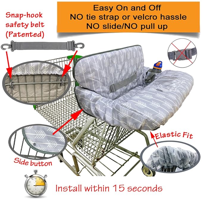 - 【Easy installation】 The patented sturdy snap-hook safety belt makes it safer and easier to use than the traditional buckle type safety strap being used by all other shopping cart covers in the market, providing robust protection for your baby girl or baby boy, even for extremely active babies. The snap-on hook design makes the installation extremely easy. No pull up and no slide even for very active babies or toddlers. Any item other than the cart cover shown on the photo are for display only, not included in this shopping cart cover product.