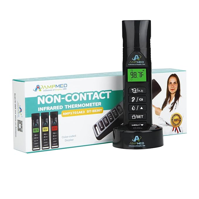 Amplim Baby Thermometer | 3-in-1 Infrared Thermometer for Ear, Forehead & Touchless, Accurate Fever Thermometer for Baby, Infants, Toddlers, Kids & Adults | Black Base Stand & Clock