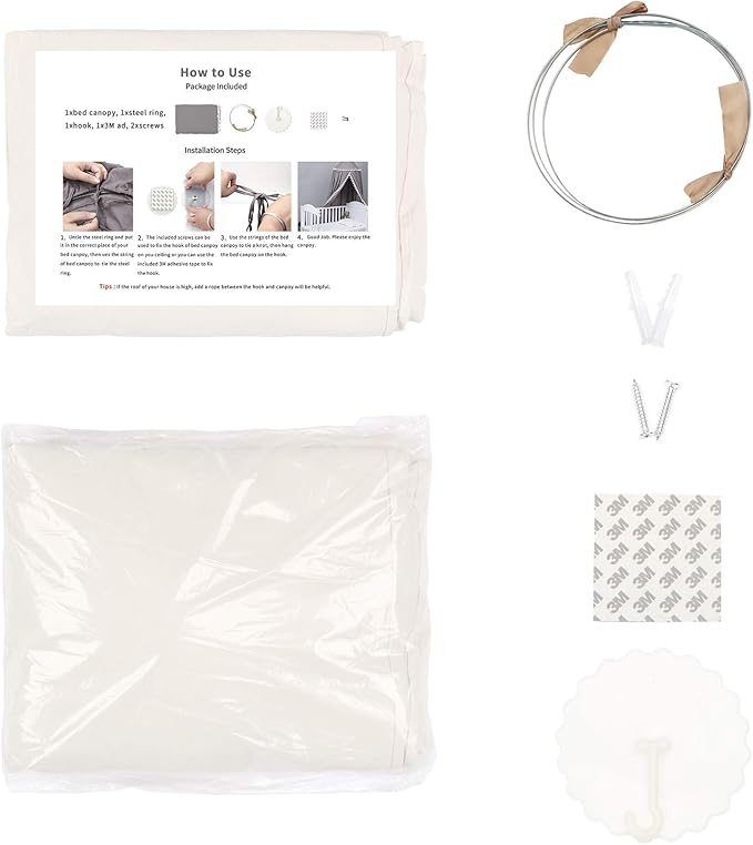 - BIG SIZE & EASY TO ASSEMBLE- Kids canopy total height 95”, upper part length 20”, dome diameter 20”. Suitable for crib or cradle, toddler bed, play area mat or rug. Features easy entry and exit opening and cutest frills decoration! Package Included: 1 x bed canopy, 1 x steel wire, 1 x double sided tape & hook panel, 2 x self-tapping screws, 1 x user manual
