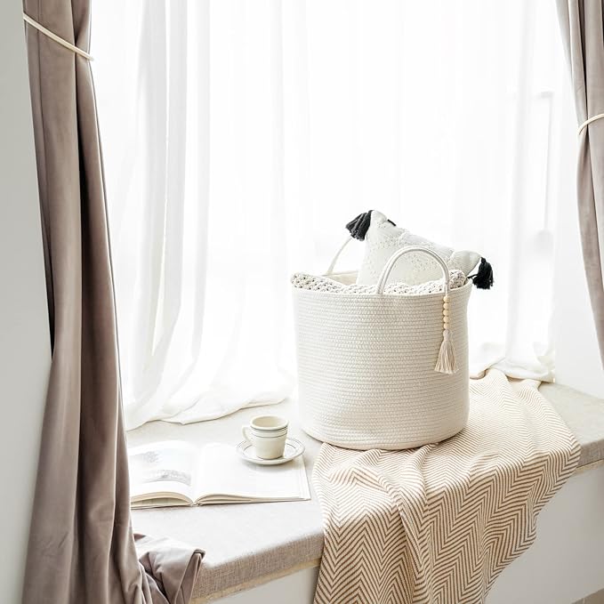 Mkono Woven Storage Basket Decorative Natural Rope Basket Wooden Bead Decoration for Blankets,Toys,Clothes,Shoes,Plant Organizer Bin with Handles Living Room Home Decor, White, 16" W × 13.8" L