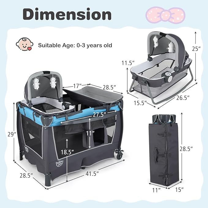 - 【All-in-one Pack and Play】 BABY JOY 5 in 1 pack and play accompanies the growth of your baby. The design of the diaper table allows the mother to easily change diapers, and the comfortable playard provides a place for the baby to rest. In addition, the soft mattress offers comfortable lying experience(Suitable Mattress Pad's Size: 38''x26''). Morever, the portable bassinet makes it more convenient for you to carry around.