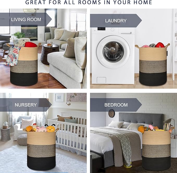 COMSE Extra Large Blanket Basket, Tall Woven Storage Basket, Nursery Hamper, 15.7”x 21.7”, Cotton Rope Laundry Hamper for Toys Clothes Towels, Brown/Black