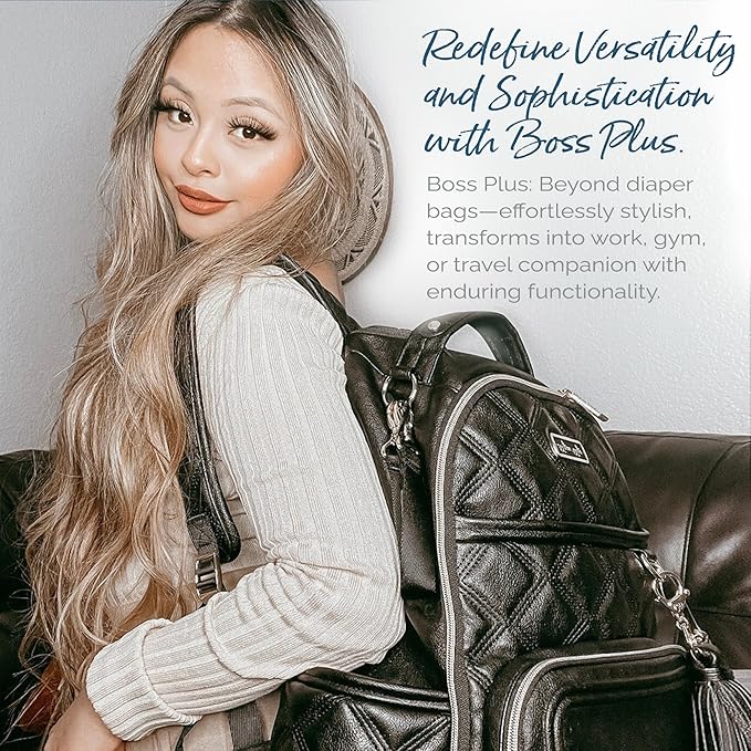 - ELEGANTLY MODERN, CLASSICALLY CHIC: Elevate your style with our Mystic Black design. This exquisite diaper backpack is made of vegan leather and features quilting-inspired accents, a unique mystical printed interior, and a removable vegan leather accent tassel adorned with an engraved chain link charm. Our Boss Plus diaper bags are so stylish that they can also be used as work bags, gym bags, or carry-ons while traveling, extending their utility long after your baby has outgrown diapers.