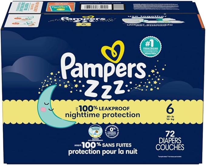 - The #1 Nighttime diaper* features a Blowout Barrier that helps prevent leaks up the back of the diaper for enhanced overnight protection and restful sleep. (*Based on US Nielsen data total number of diapers sold L52W, ending 7/27/24)