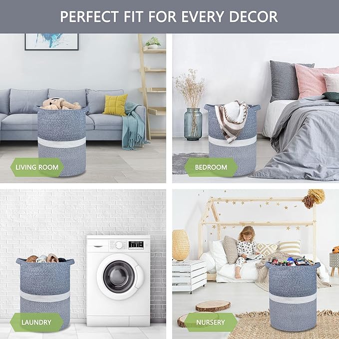 Large Blanket Basket, Nursery Hamper, Tall Laundry Basket 72L, Cotton Rope Woven Laundry Hamper for Storage Toys Clothes Towels, 16”x 22”, Blend Navy Blue & White