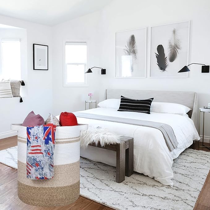 - 【Notes】Laundry Basket fold up during transported, it will return to its best shape if filling it with towels or blankets. Fast remove the creases by ironing it. We only offer high quality products so we are sure you will be satisfied with our cotton rope basket. If you have any dissatisfaction, please contact us and We will provide you with a satisfactory solution.