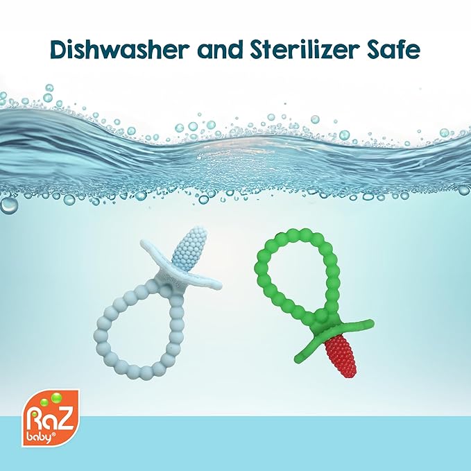 - Easy to Clean & Sanitize: These durable teethers are also dishwasher-safe and sanitizer-safe, making cleanup a breeze! Perfect as a baby shower gift for boys or girls.For optimal hygiene and as with all baby toys, sanitize your RaZberry teething toy in boiling water for 5 minutes before first use.