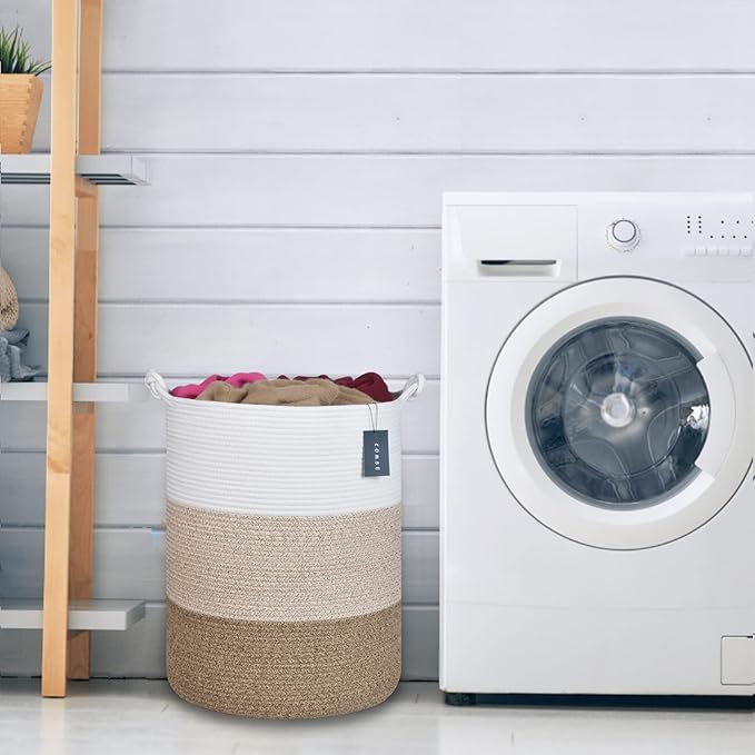 COMSE Extra Large Blanket Basket, Tall Woven Storage Basket, Nursery Hamper, 15.7”x 21.7”, Cotton Rope Laundry Hamper for Toys Clothes Towels, White/Gradient Brown