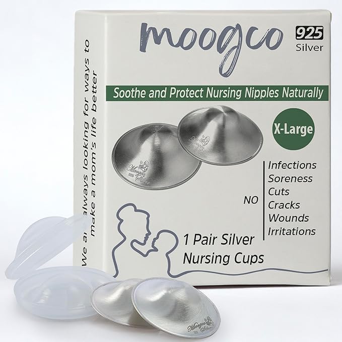 Moogco The Original Silver Nursing Cups - Nipple Shields for Nursing Newborn - Breastfeeding Essentials - Newborn Essentials Must Haves - Nipple Covers Breastfeeding - 925 Silver (X-Large)