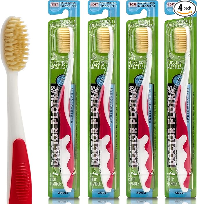 MOUTHWATCHERS Soft Flossing Toothbrushes, Value Pack of 4, Red, Manual Toothbrush for Adults, Ultra Clean, Good for Sensitive Teeth and Gums, by Dr. Plotka's