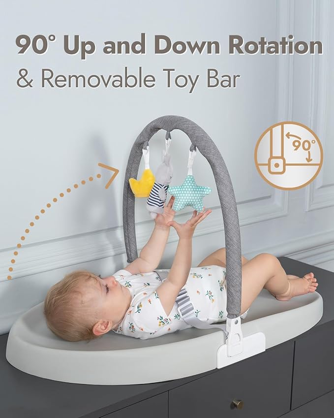 - 90° Up and Down Rotation & Removable Toy Bar: Includes a crown with a baby-safe mirror, a star with hidden crinkle paper, and a rabbit doll keeps the baby entertained. The toy bar attracts your baby to look, play and grasp while you change the diaper, and easy to store while not in use.