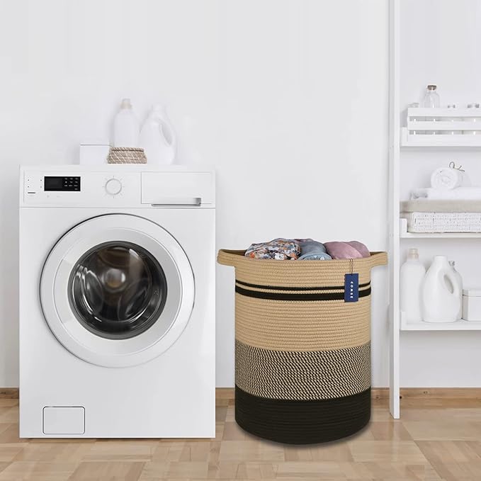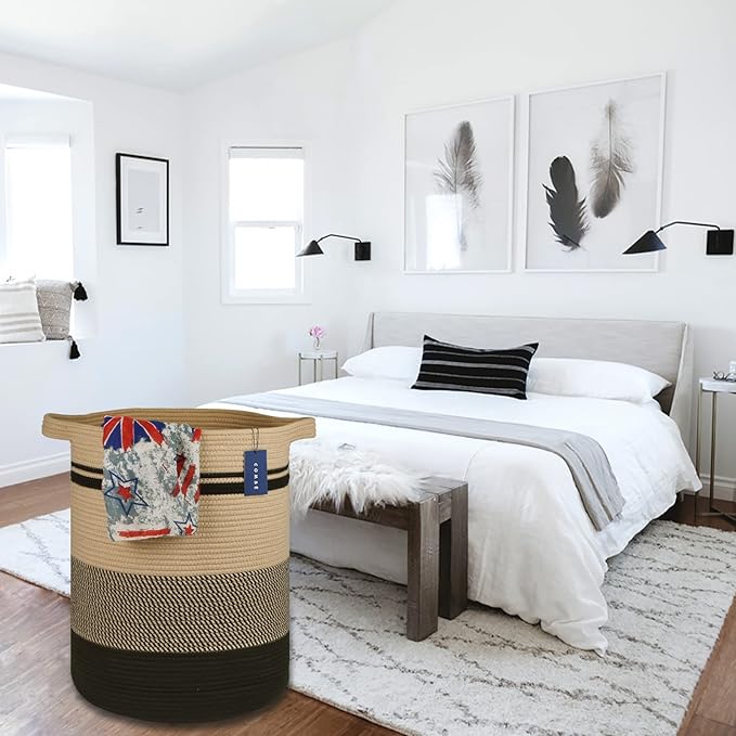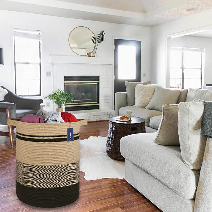 COMSE Extra Large Blanket Basket, Tall Laundry Basket, Nursery Hamper, 15.7”x 21.7”, Cotton Rope Woven Laundry Hamper for Storage Toys Clothes Towels, Brown/Black
