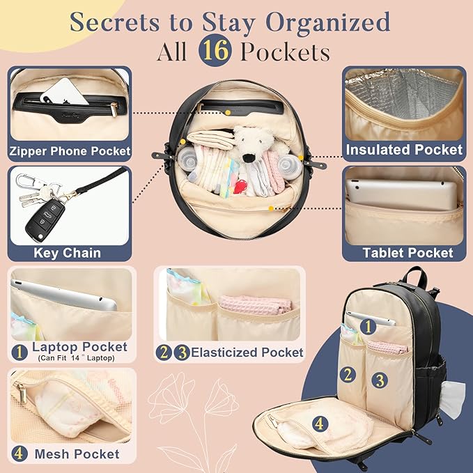 miss fong Diaper Bag Backpack Leather Diaper Bag, Baby Diaper Bag for Baby, 16 Pockets with Hand Sanitizer Holder, Changing Pad, 2 Insulated Pockets(Black)