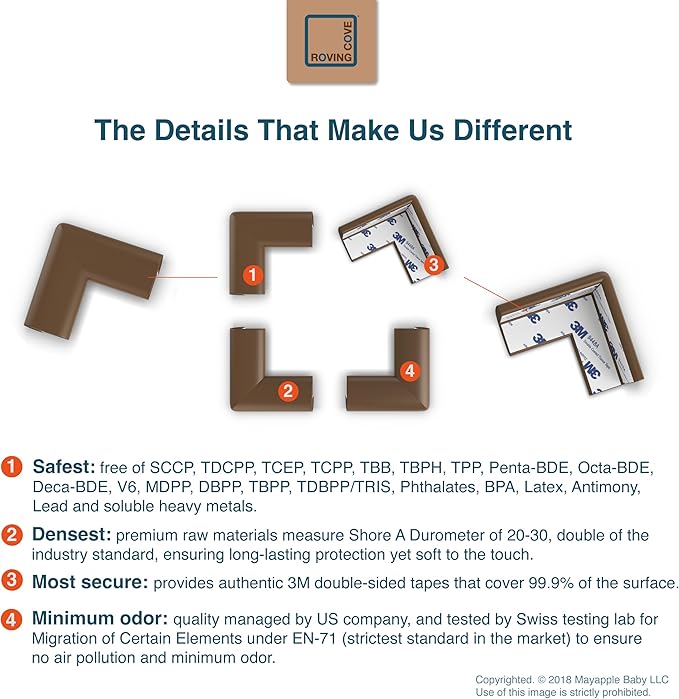 - CLEAN SAFETY: Roving Cove uses safe and pure raw material and was the first brand to make foam safety bumpers without the use of toxic flame-retardant chemicals (SCCPs). Our corner protector contains no BPA, no phthalates, no heavy metals, no latex, no SCCPs. Inherently flame-resistant; passed flammability tests under US regulations.