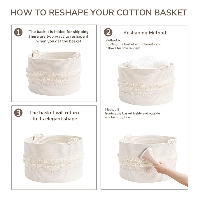 - Note. This rope basket is folded for shipping. It will turn back to its elegant shape quickly by filling it with towels or blankets. For faster reshaping, ironing at low heat is effective! Also, you can fold it into a flat shape for easy storage when not in use.