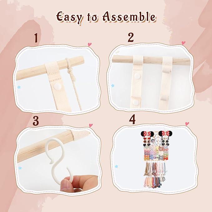 - Easy To Assemble : This new multifunctional bow holder for girls hair bows is easy to assemble, just follow the steps on the picture or in the video to assemble the hook and rope quickly. It can be completed with the baby's parent-child activities to promote the baby's good hands-on ability.