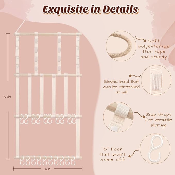 - Premium Quaity Material : The hair accessories organizer is made of sturdy and soft polyester-cotton belt, the wooden stick is made of beech wood that is not easy to crack and deform, and the hook adopts the newly designed "S" hook, which will not fall off and is more smooth and durable.