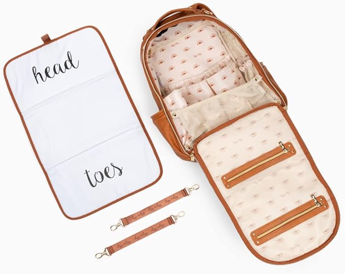 - ELEGANTLY MODERN, CLASSICALLY CHIC: Elevate your style with our Cognac Boss Plus design. This exquisite diaper backpack features a sun-printed interior, and a removable vegan leather accent tassel adorned with an engraved chain link charm, adding a dash of sophistication to your ensemble. Our Boss Plus diaper bags are so stylish that they can also be used as work bags, gym bags, or carry-ons while traveling, extending their utility long after your baby has outgrown diapers.