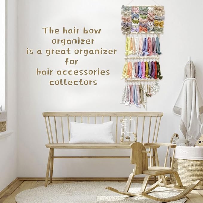 - Easy To Assemble : This headband holder is assembled from five canvas straps, four wooden sticks and one cotton hemp strip. Just apply the rope and cotton ribbons on each row of sticks, follow a few steps explained in the video for a successful installation. Then the bow holder organizer can be hung on the wall, cabinet, or door to perfectly decorate the room.