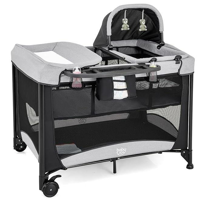 BABY JOY 4 in 1 Pack and Play, Portable Baby Playard with Bassinet & Diaper Changing Table, Infant Bassinet Baby Crib Activity Center with Toys & Oxford Bag from Newborn to Toddlers (Dark, Classic)