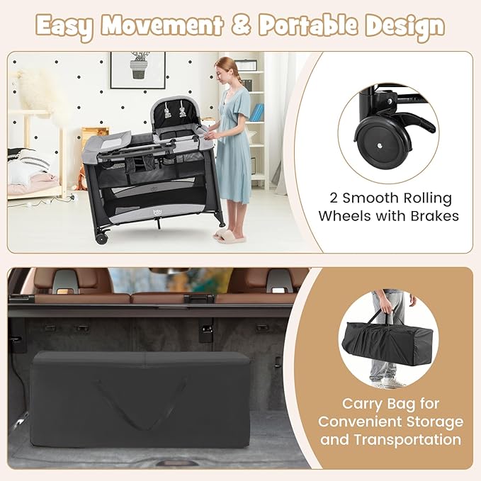 - 【2-in-1 Portable Bassinet Design】 The 30" x 18" x 21.5" portable bassinet can be used on or off the nursery center. You can use it with the playard, or take it apart to use, it's more convenient for you to carry and you can keep baby by your side wherever you go.In addition, two hanging toys on the baby bassinet can make your baby fall asleep while also promoting the baby's visual development and improving the grasping ability.