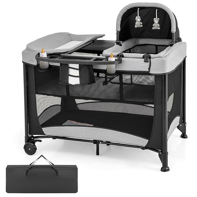 HONEY JOY Pack and Play with Bassinet, 5 in 1 Portable Baby Playard w/Changing Table, Removable Infant Full-Size Bassinet & Mattress, Diaper Storage Bag, Foldable Newborn Nursery Center w/Carry Bag