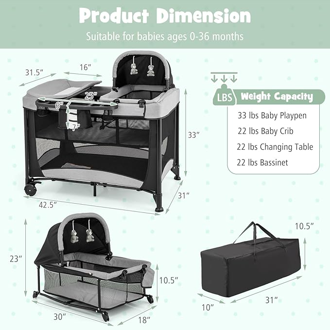 - 【5-in-1 Pack and Play】This baby playard comes with removable full-size bassinet, baby crib, infant bed, activity center and diaper changing table. When your child grows old, you can remove the nest to provide more room for child to climb or walk. This luxurious pack and play will meet your various needs in one and accompany your child’ growth ages 0-36 months.