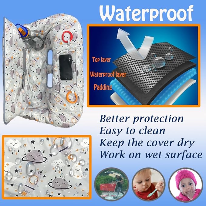 - 【Waterproof protection】 Our grocery cart cover and high chair cover restaurant boast an added waterproof layer, ensuring protection on wet surfaces. This feature sets it apart from most other shopping cart seat cover for infant and todder.