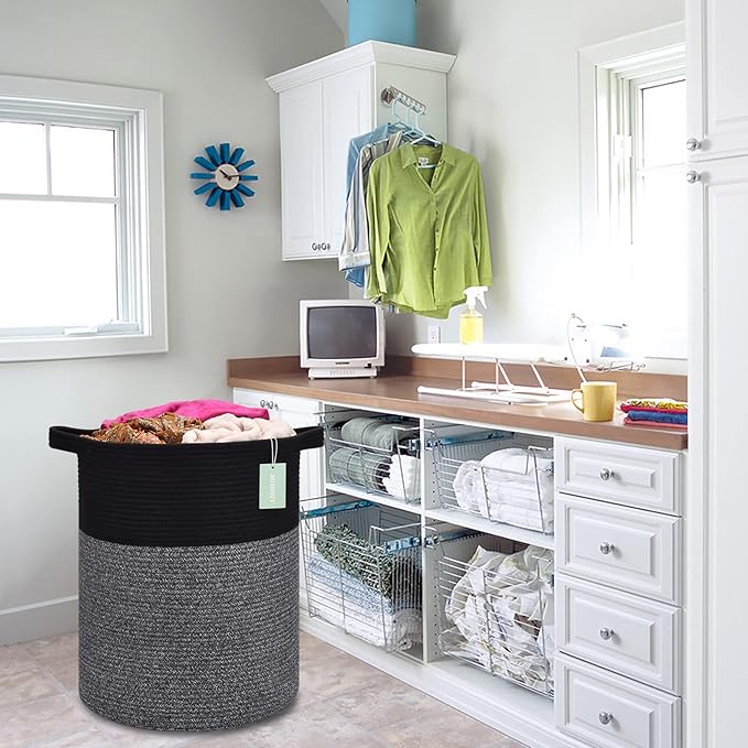 BOSROTY Large Laundry Hamper for Girls Boys Kids 72L, Nursery Hamper, Tall Laundry Basket, Cotton Rope Woven Blanket Basket for Storage Toys Clothes Towels, 16”x 22”, Black & Gray