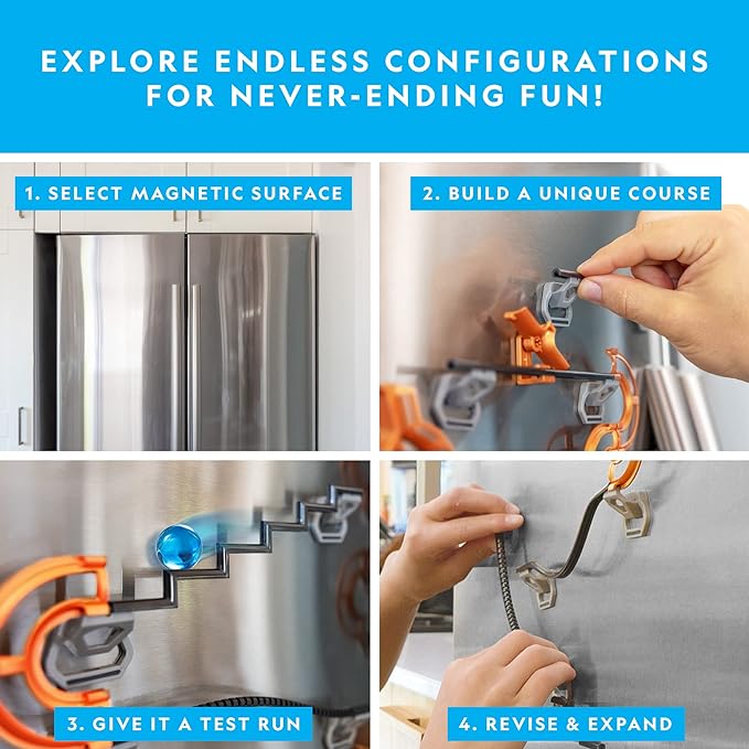 - BUILD ANYWHERE MAGNETS STICK - This STEM marble maze for kids and adults can be built on any vertical magnetic surface like the fridge, lockers, whiteboards, workbenches & more!