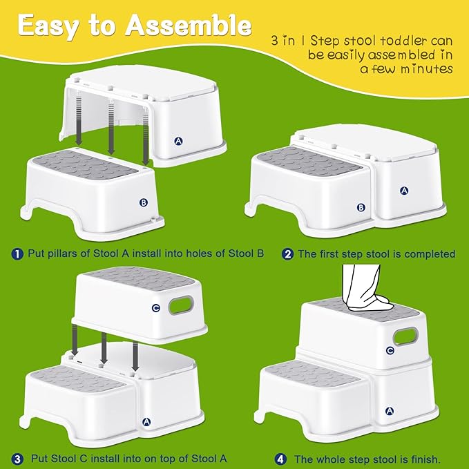 - Easy To Assemble & Clean: Please refer to the manual, and the 3 in 1 step stool for toddlers can be easily assembled in a few minutes. And the toilet stool is easy to clean with a damp cloth or by simply rinsing in the sink.