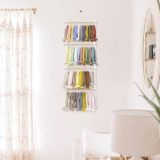 - Easy To Assemble : This headband holder is assembled from five canvas straps, four wooden sticks and one cotton hemp strip. Just apply the rope and cotton ribbons on each row of sticks, follow a few steps explained in the video for a successful installation. Then the bow holder organizer can be hung on the wall, cabinet, or door to perfectly decorate the room.