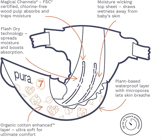 - GOOD FOR THE PLANET: Pura’s diapers are manufactured in a carbon neutral plant, powered by green electricity. Where possible, we’ve replaced non-sustainable materials with lower impact materials such as wood pulp from sustainably managed forests in the absorbent core of our diapers. Our packaging is made from paper, so it's easier to recycle!