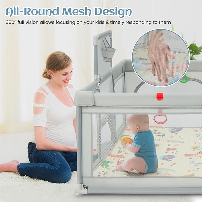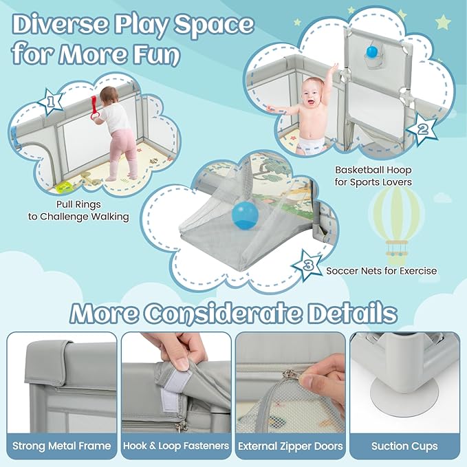 - Spacious Baby Playpen: Our Infant 74 "x 62" baby playpen provides large area for babies to play and hold many toys. With 50 ocean balls, 4 pull up rings, basketball hoop and 2 soccer gates, it promotes physical and cognitive growth. The fence is 27 inches high, and it's high enough to keep the baby from climbing out