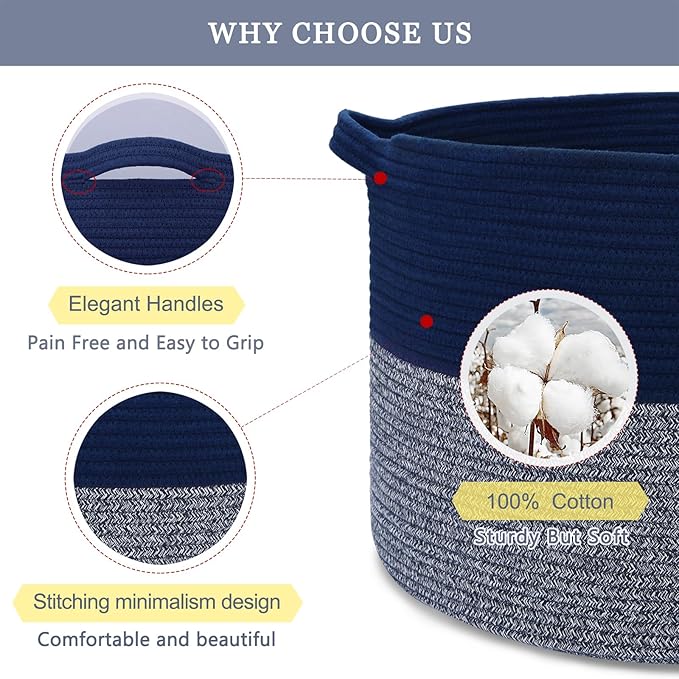 Extra Large Blanket Basket 87L, Laundry Hamper, Baby Nursery Hamper for Storage Toys Clothes Towels, Large Cotton Rope Laundry Basket for Girls Boys, 22”x 14”, Navy Blue