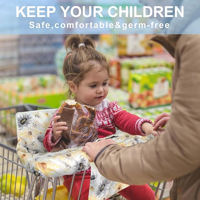 - đ¶ăCOMPREHENSIVE PROTECTIONăOur shopping cart cover for baby features a safety harness to straps to securely hold your child in the trolley. Touching the soft thick padding made from breathable fabric, baby feels comfortable while keeping away from common dirt on grocery cart and restaurant chairs.