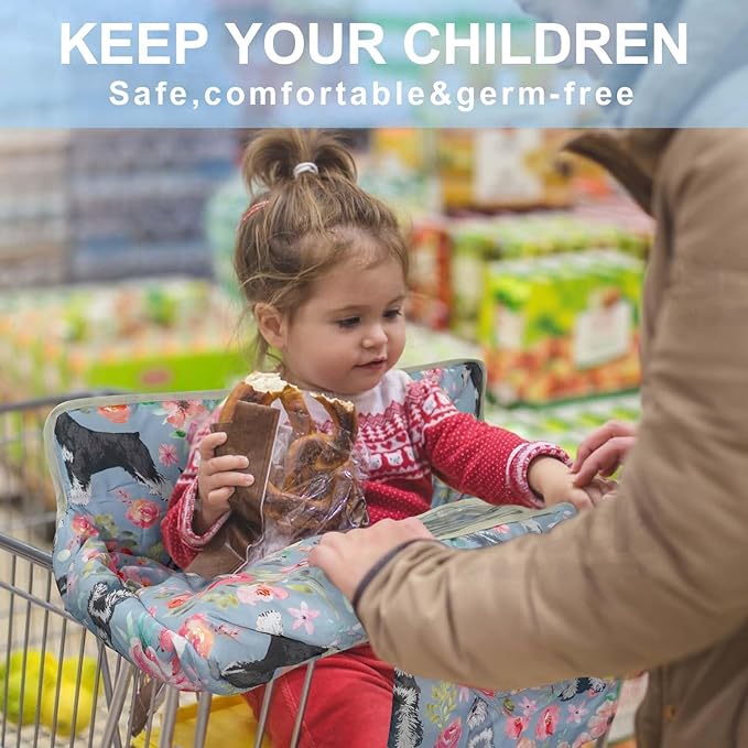 - đ¶ăCOMPREHENSIVE PROTECTIONăOur shopping cart cover for baby features a safety harness to straps to securely hold your child in the trolley. Touching the soft thick padding made from breathable fabric, baby feels comfortable while keeping away from common dirt on grocery cart and restaurant chairs.