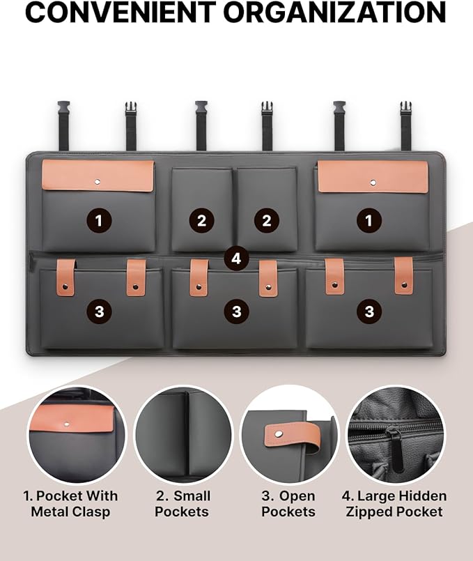 - SMART 8-POCKET DESIGN. Includes two flap pockets, two middle bottle slots, three roomy lower bins, and one hidden zipper compartment running the full length for blankets or tools.