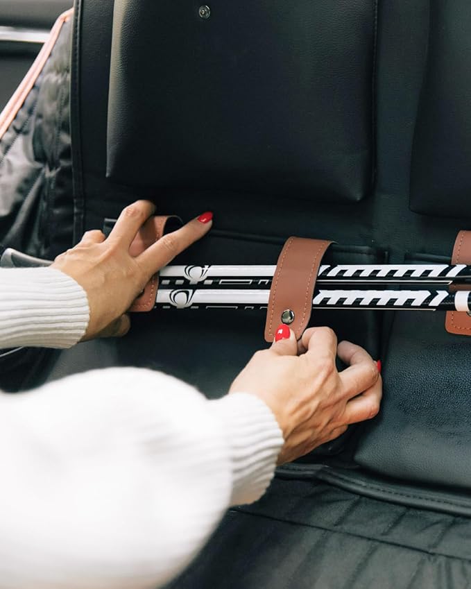 - STAYS PUT ON THE ROAD. Three adjustable straps fix to headrests, with side anchors for extra security. Unlike bins that slide, this cargo holder won’t budge on sharp turns or bumpy rides.
