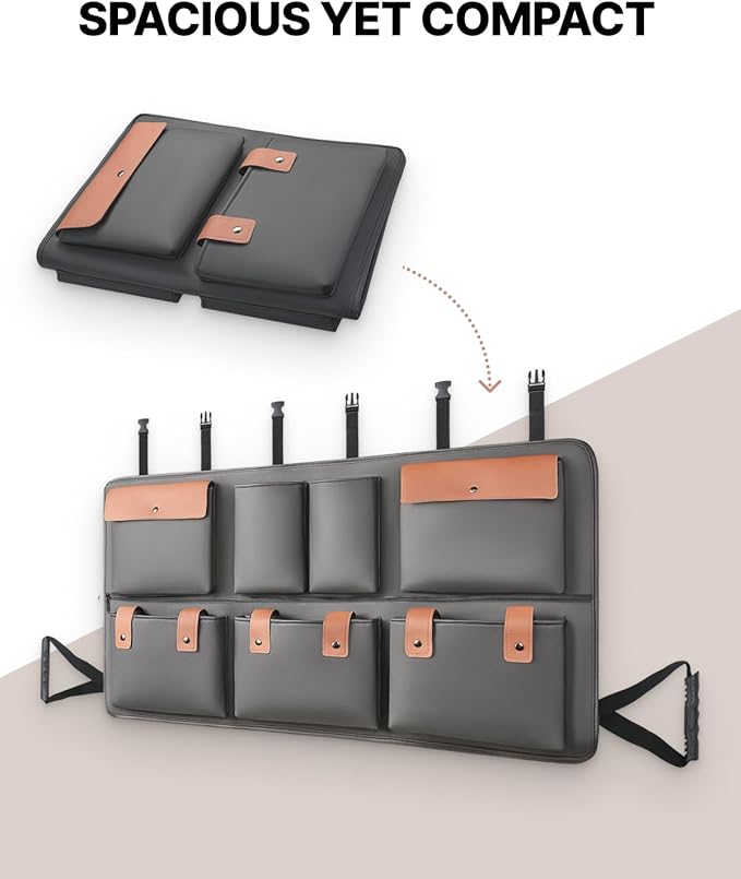 Owleys Hanging Car Trunk Organizer | Eco Leather Back Seat Storage 39"x19" | 8 Pockets with Zipper Compartment | Waterproof Cargo Holder for SUV & Sedan | Black&Brown