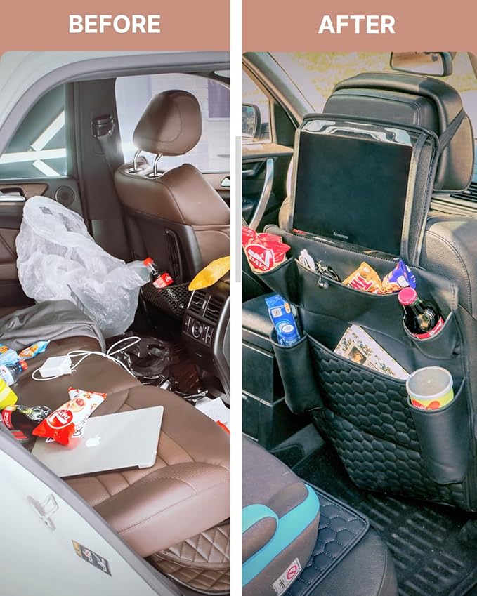 - MAKE FAMILY TRIPS STRESS-FREE. Long road ahead? This back of seat organizer for kids keeps snacks, coloring books, and water bottles not in the trunk but right where little hands can reach. Say goodbye to backseat chaos, hello to happy little passengers.