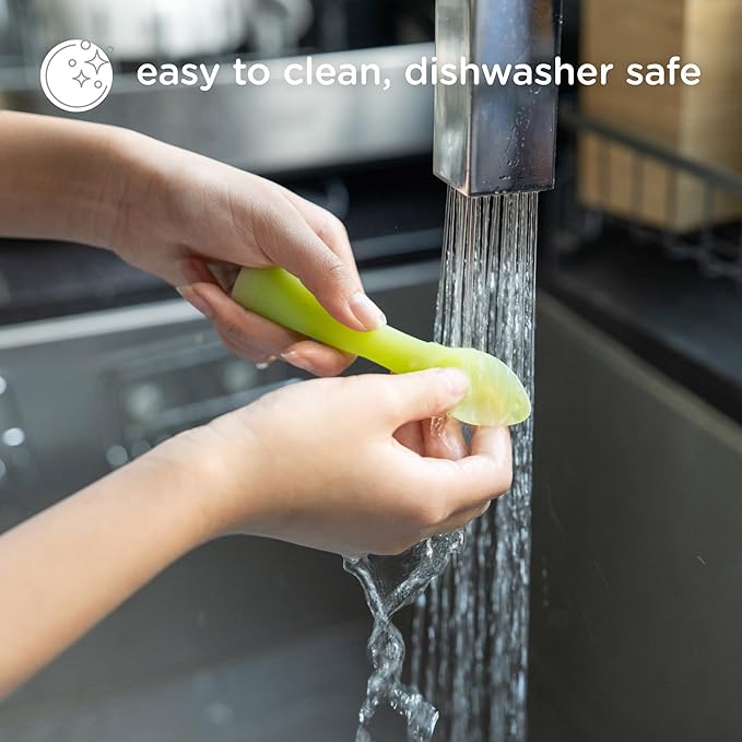 - INNOVATIVE DESIGN: Inspired by natural plant elements, the leafy flexible silicone tip enables scooping food at any angle. Spoon base allows for hygienic, upright placement on any surface, keeping the spoon clean.