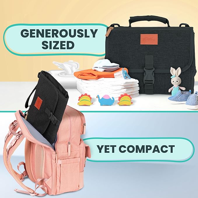 - Generously Sized yet Compact: Organized baby essentials with 2 inner mesh pockets, front storage bag (key holder and outer pocket), and easy-access wipes holder. Experience hassle-free diaper changes blending versatility and comfort. Our diaper changing mat is padded with a soft memory foam pillow. You can detach this extra storage space when you just need a simple changing pad! Equipped with a spacious 27” by 22” changing area, it folds into a compact 8" by 11" clutch for easy storage.