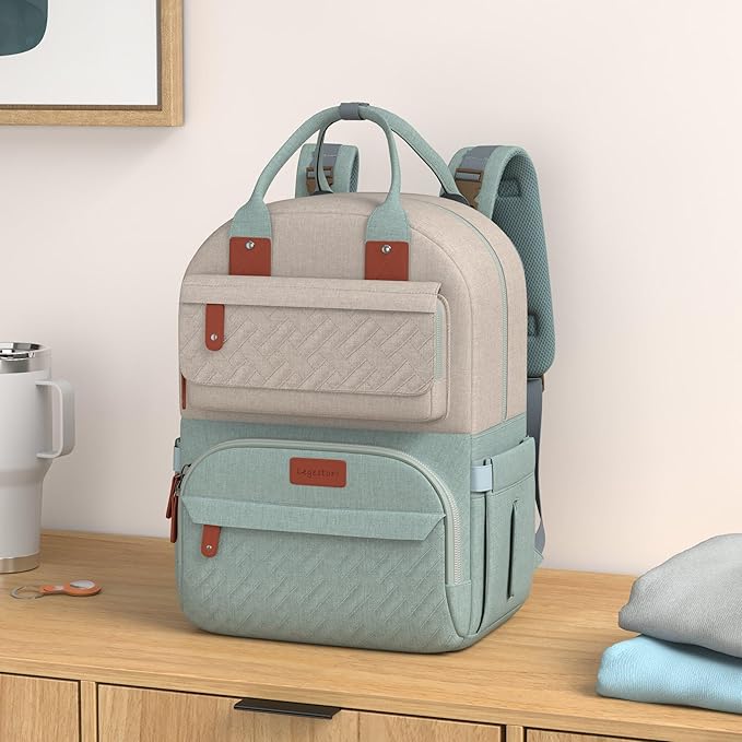 - Lightweight durability baby diaper bag is stylish and practical made of waterproof oxford fabric with leather pullers finest lining that is easy to clean and never fade and wrinkles. Designer green and beige patchwork is more catch your eyes. The zipper slides smoothly for easy access to items and mesh pocket organizers and other organization essentials.