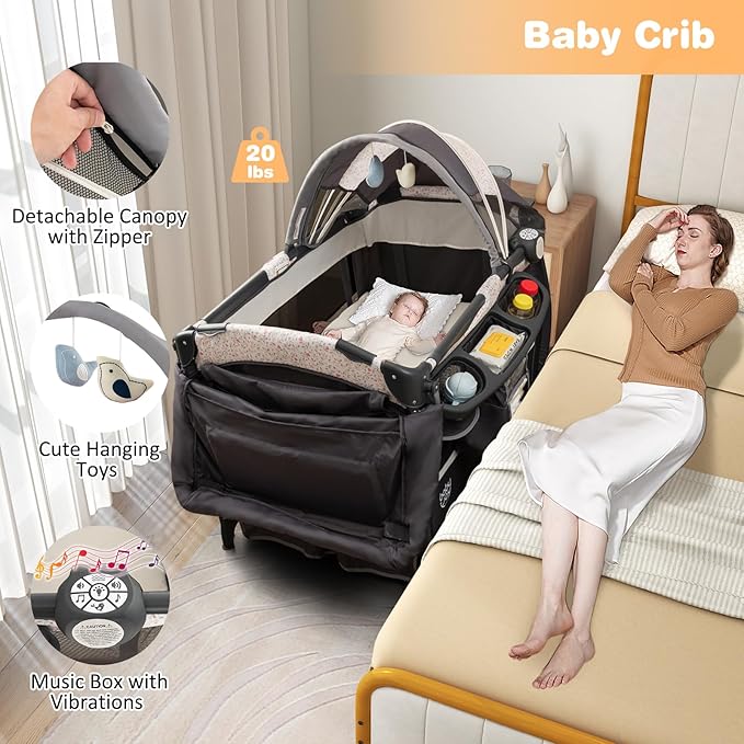 - 【Detachable Canopy with Music Box Toys】This baby pack and play comes with a multifunctional music box which has nature sounds, music, vibration, night light, etc which can soothe your baby and let the baby fall asleep quickly. (4 AA batteries required and not included). What's more, the removable canopy with 2 adorable toys not only helps to block strong light, but also improving the baby's grasping ability.